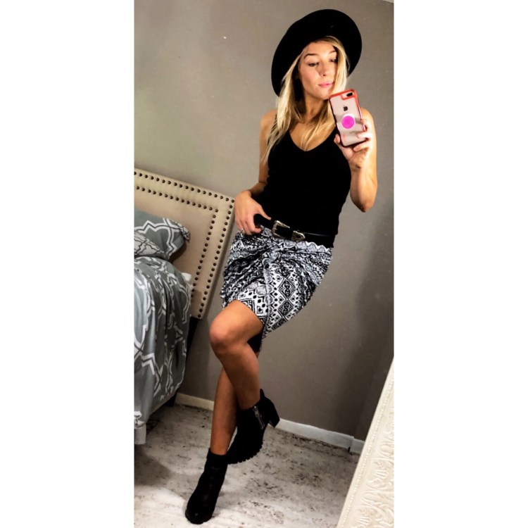 The last item I worked with today was this printed wrap skirt, I believe I purchased it at Nordstrom a few years ago. It has always been cute to me but not until recently did print skirts come back into style. I paired it with a standard blank tank from express, a western belt from express, a black hat, and black zippered boots from target.