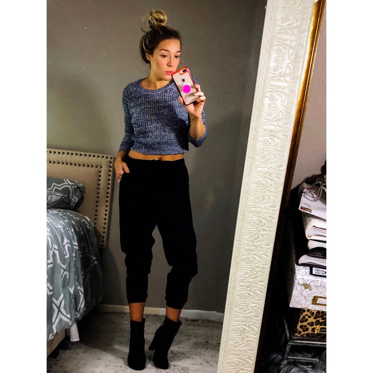 Below is a more chunky knit crop top. I have mixed feelings about this one, I am not sure I will keep it but it looked cute with the black joggers from the gap and heels by Sam Edelman. This could be more of a weekend or weekday night out outfit. It’s a little to thick of a knit for spring in Texas. Back to the back of the closet it goes.